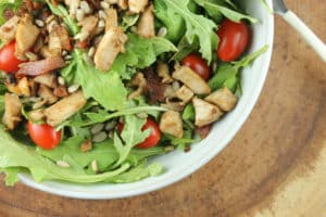 A salad becomes a meal with a hearty, savory dressing and chicken. Sunflower seeds add crunch, and it all compliments the peppery arugula nicely.