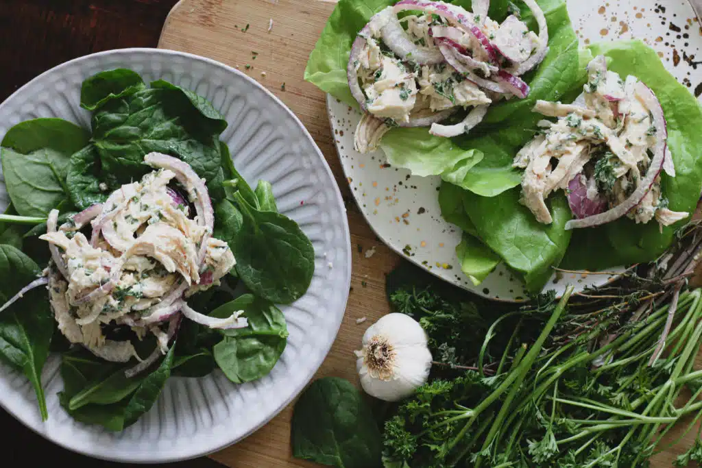 I think the best way to eat this chicken salad is on big pieces of butter lettuce. You could also do it on a bed of baby spinach leaves. Or you could eat it straight out the bowl or as a dip for baby carrots.