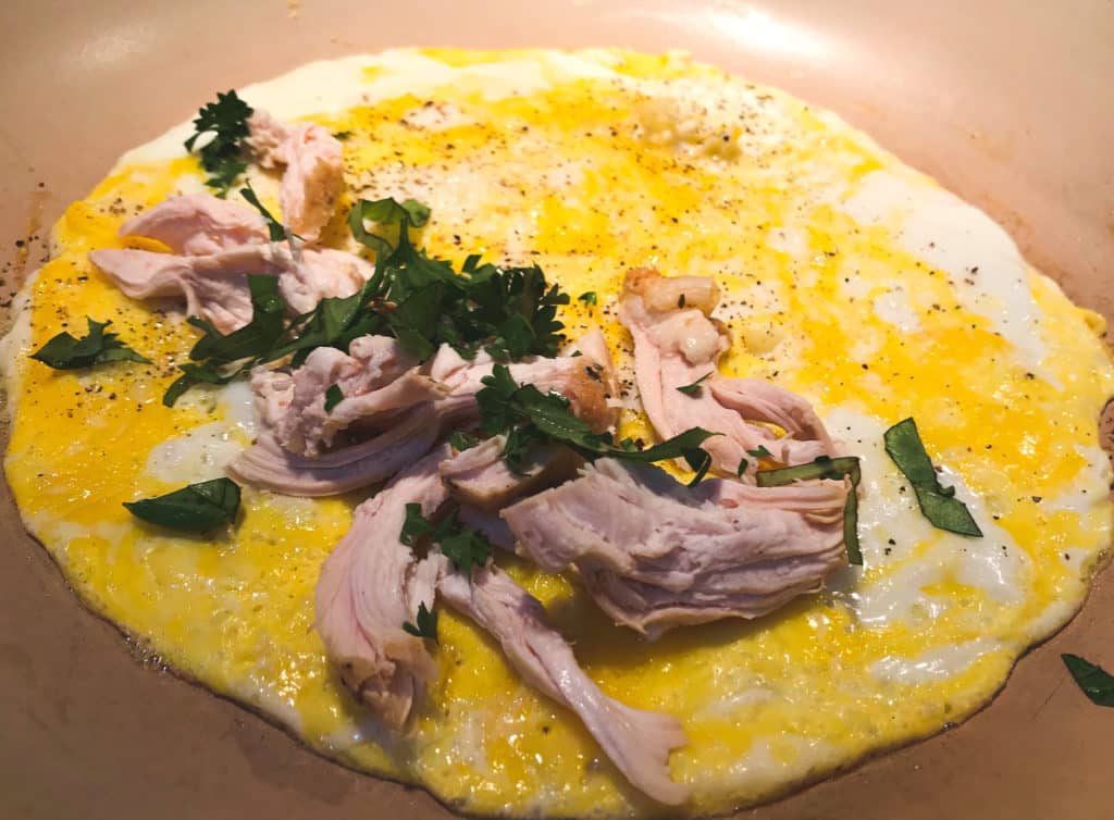 Once you have your omelet base set up, you can add the chicken and fresh herbs on top. At this point, you’ll carefully fold one half of the eggs over the chicken to form your omelet. Keep it on the pan until it’s warmed all the way through.