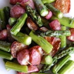 This simple recipe makes great use of extra spring vegetables. Radishes and asparagus are roasted together in the oven to create a simple side dish. Roasting the radishes slightly changes their flavor and makes them a bit softer and sweeter. The asparagus does not take as long to cook, so it is added halfway through the roasting process.