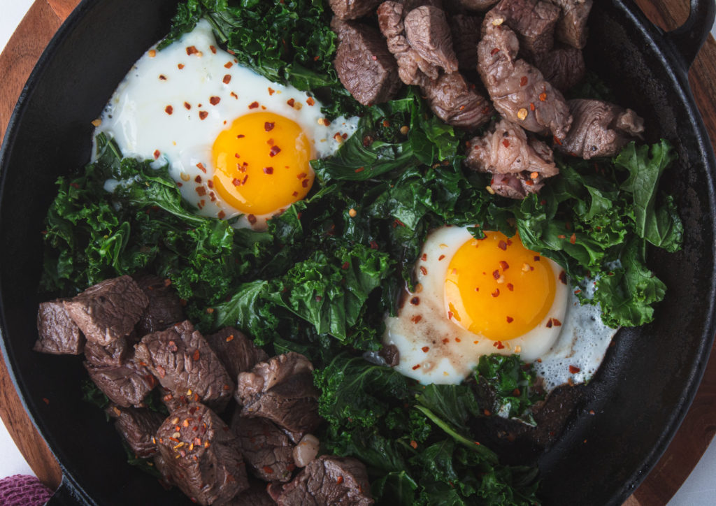If there was such a thing as a “Gains Bowl”, this breakfast may just be that meal. You’ve got protein-packed steak and eggs and nutrient-dense greens that make this a complete and filling meal.